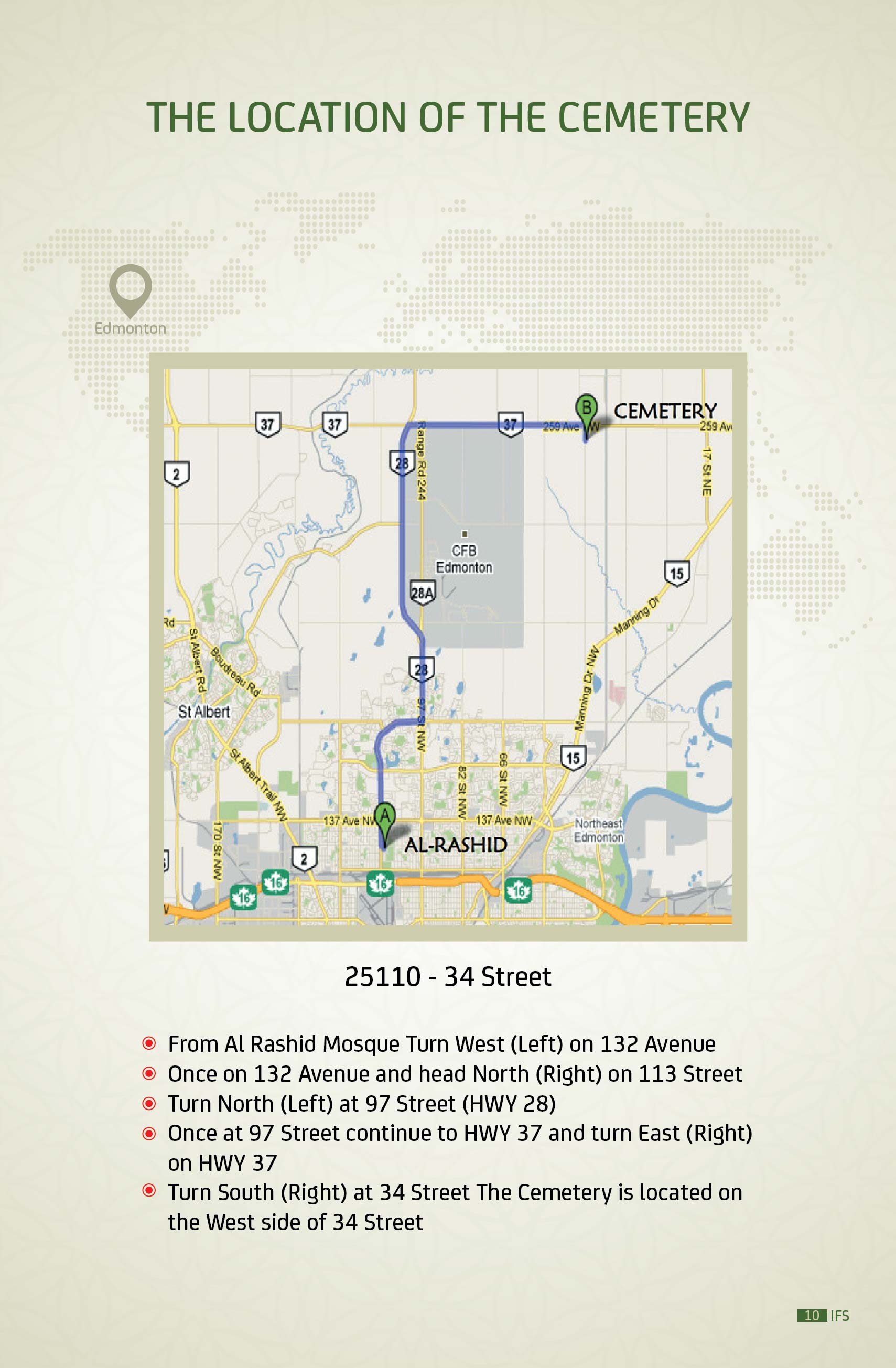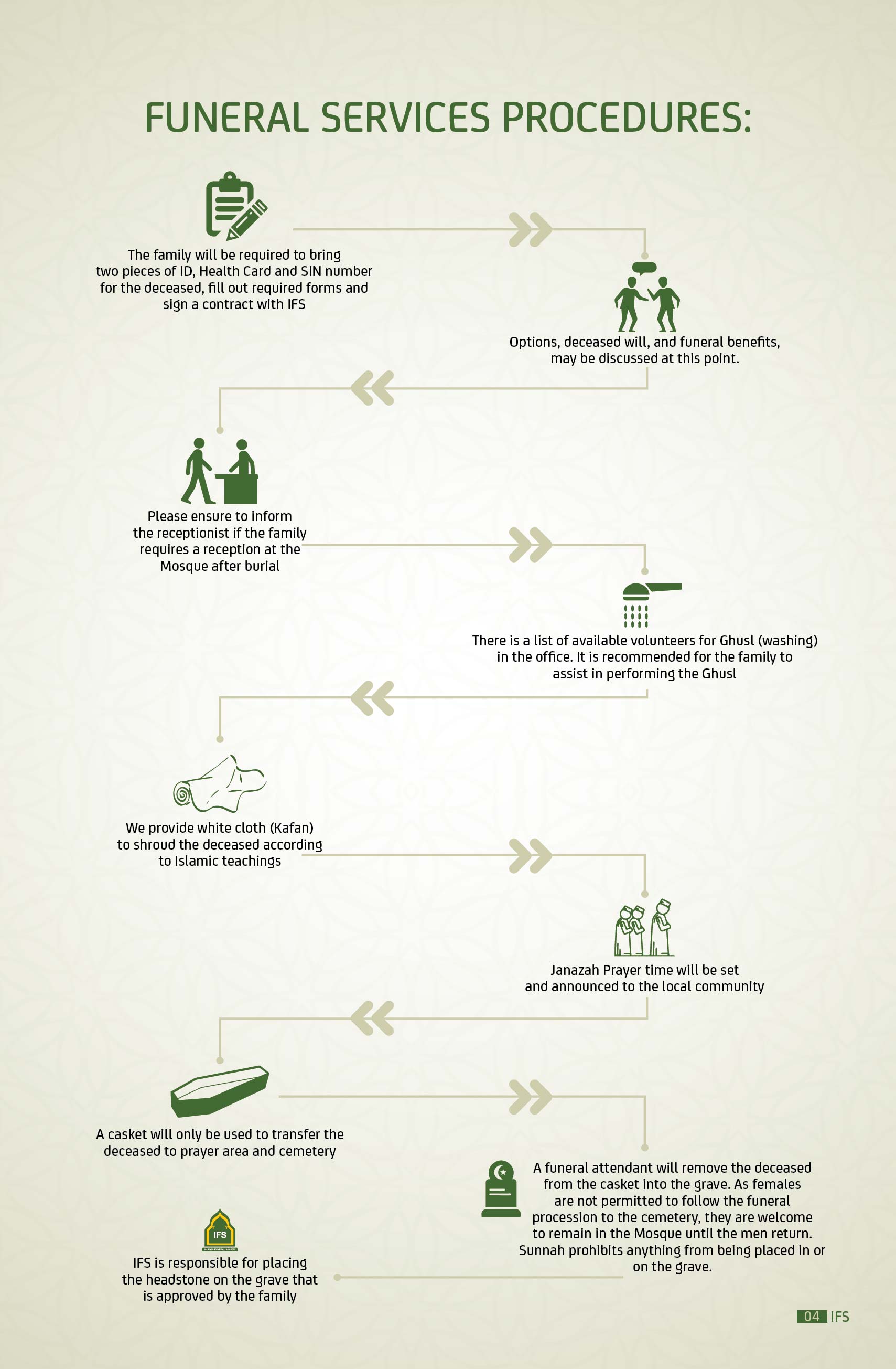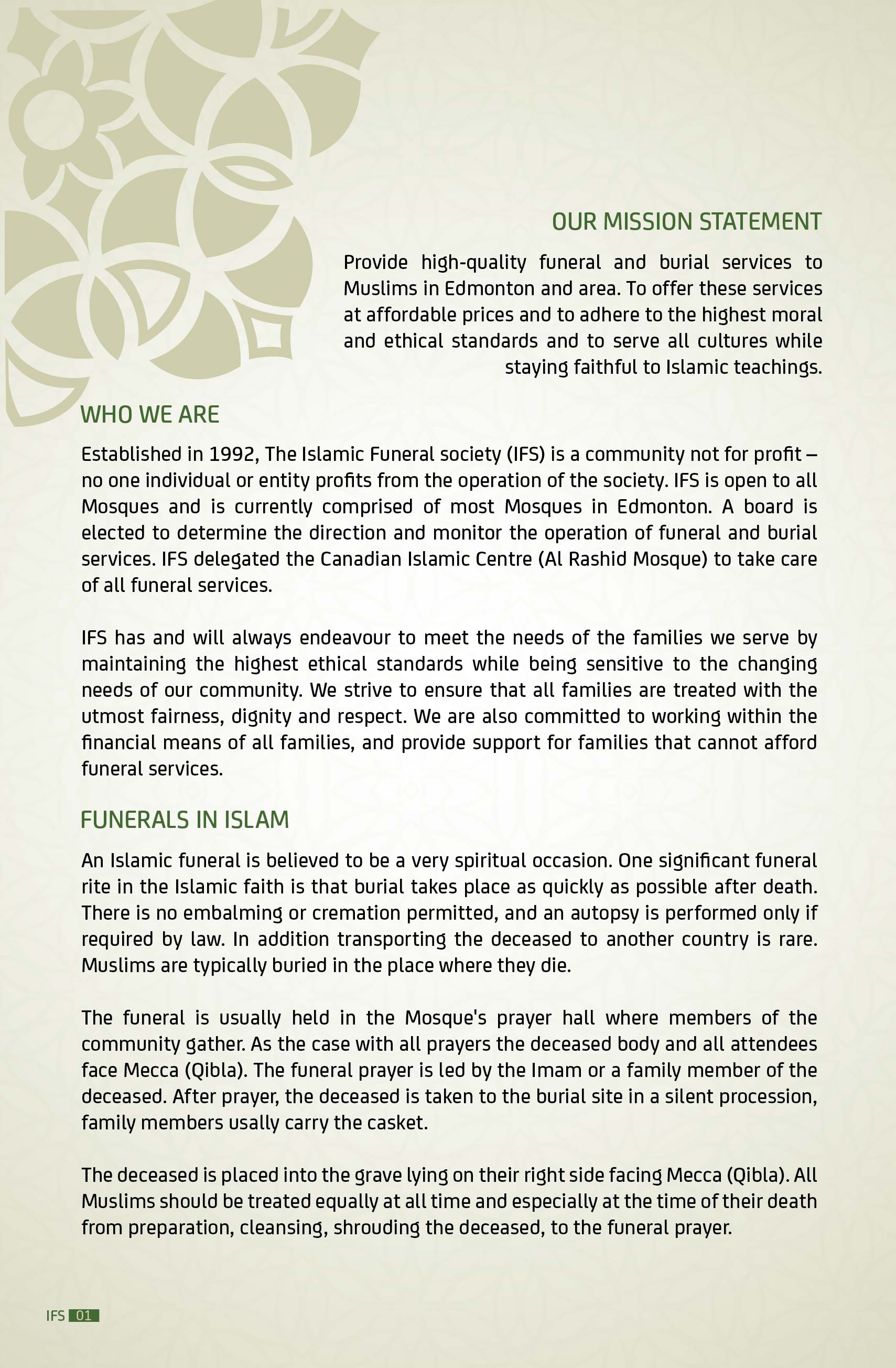 IFS is comprised of all the Mosques in Edmonton who elect an executive board to determine the direction and monitor the operation of funeral and burial services. IFS delegated the Canadian Islamic Centre (Al Rashid Mosque) to take care of all funeral services.