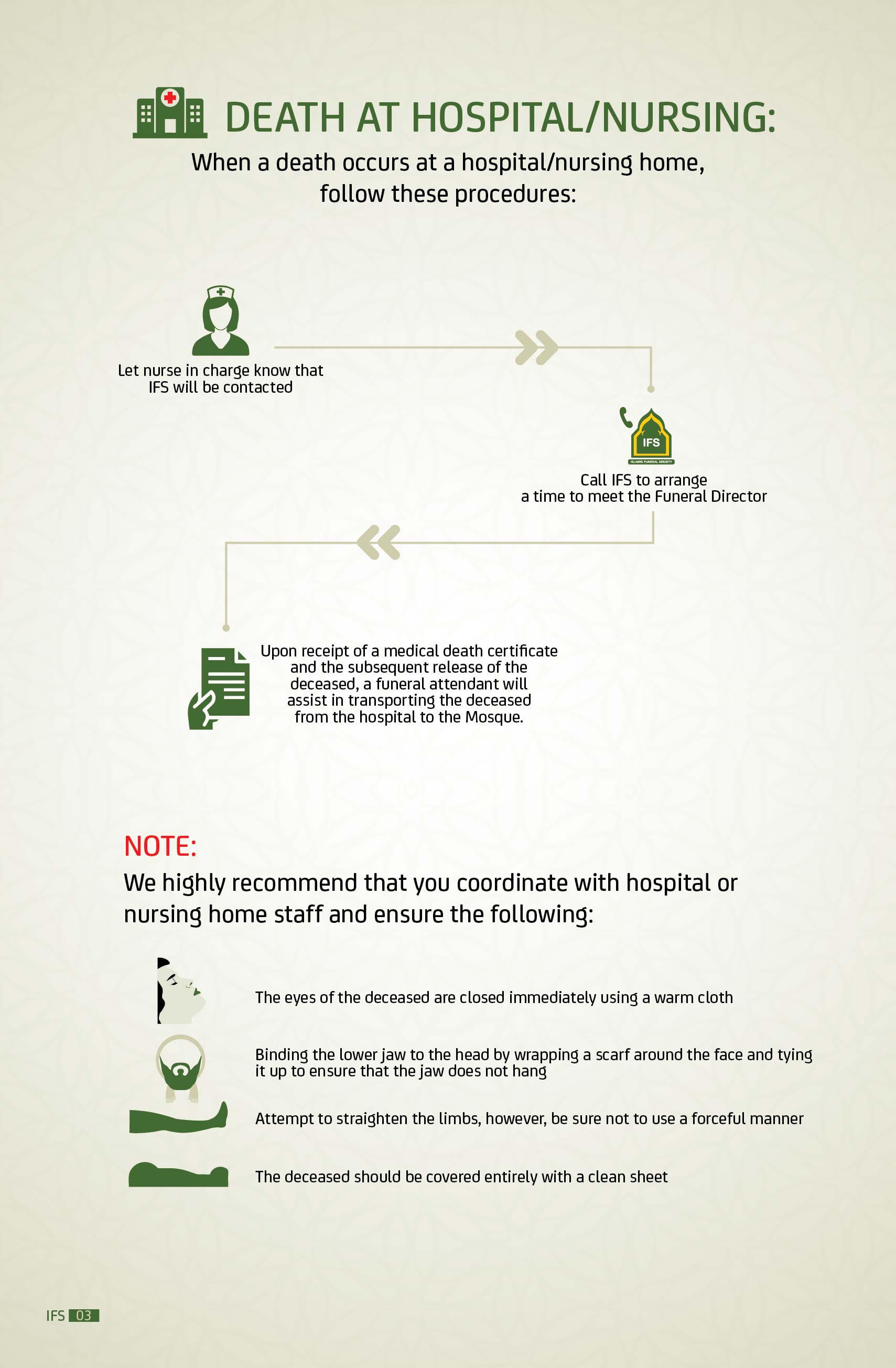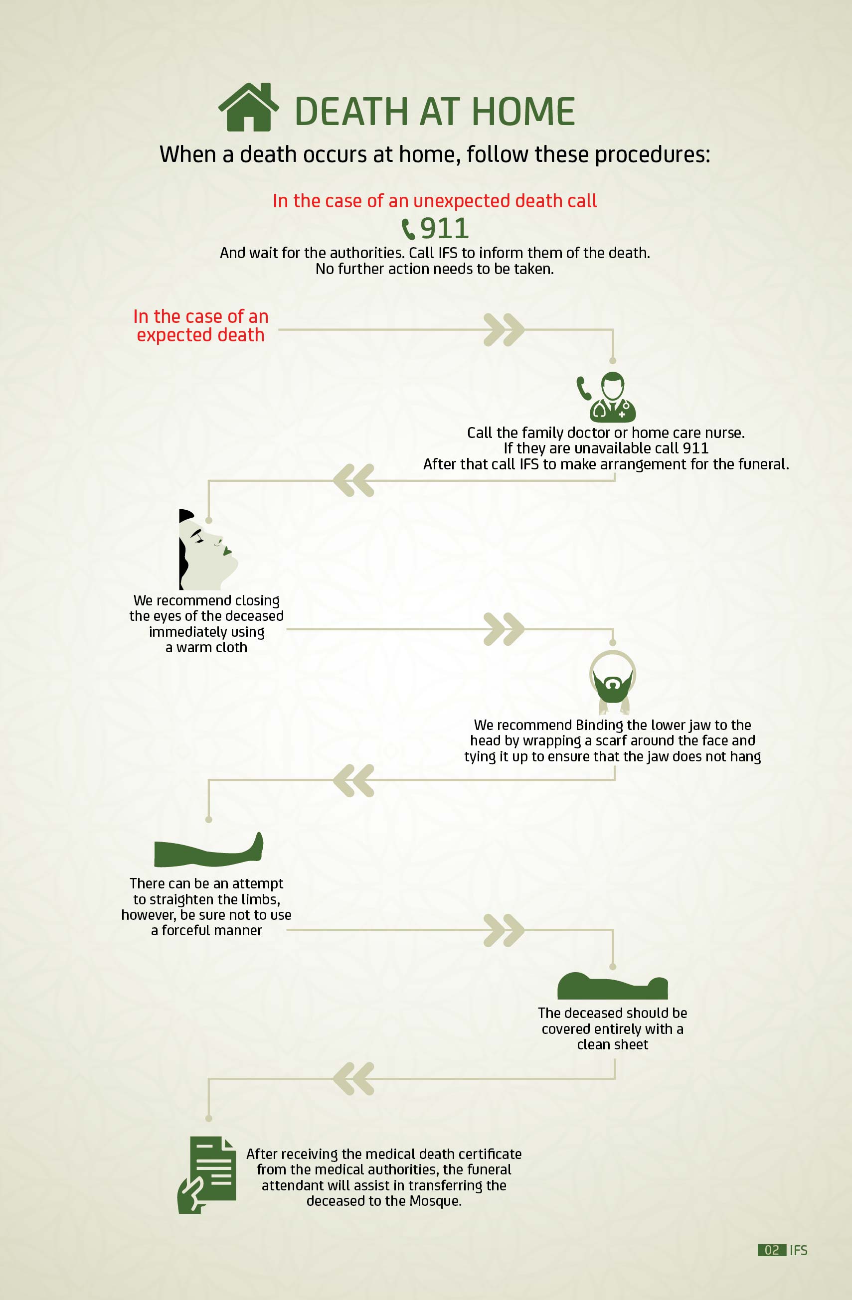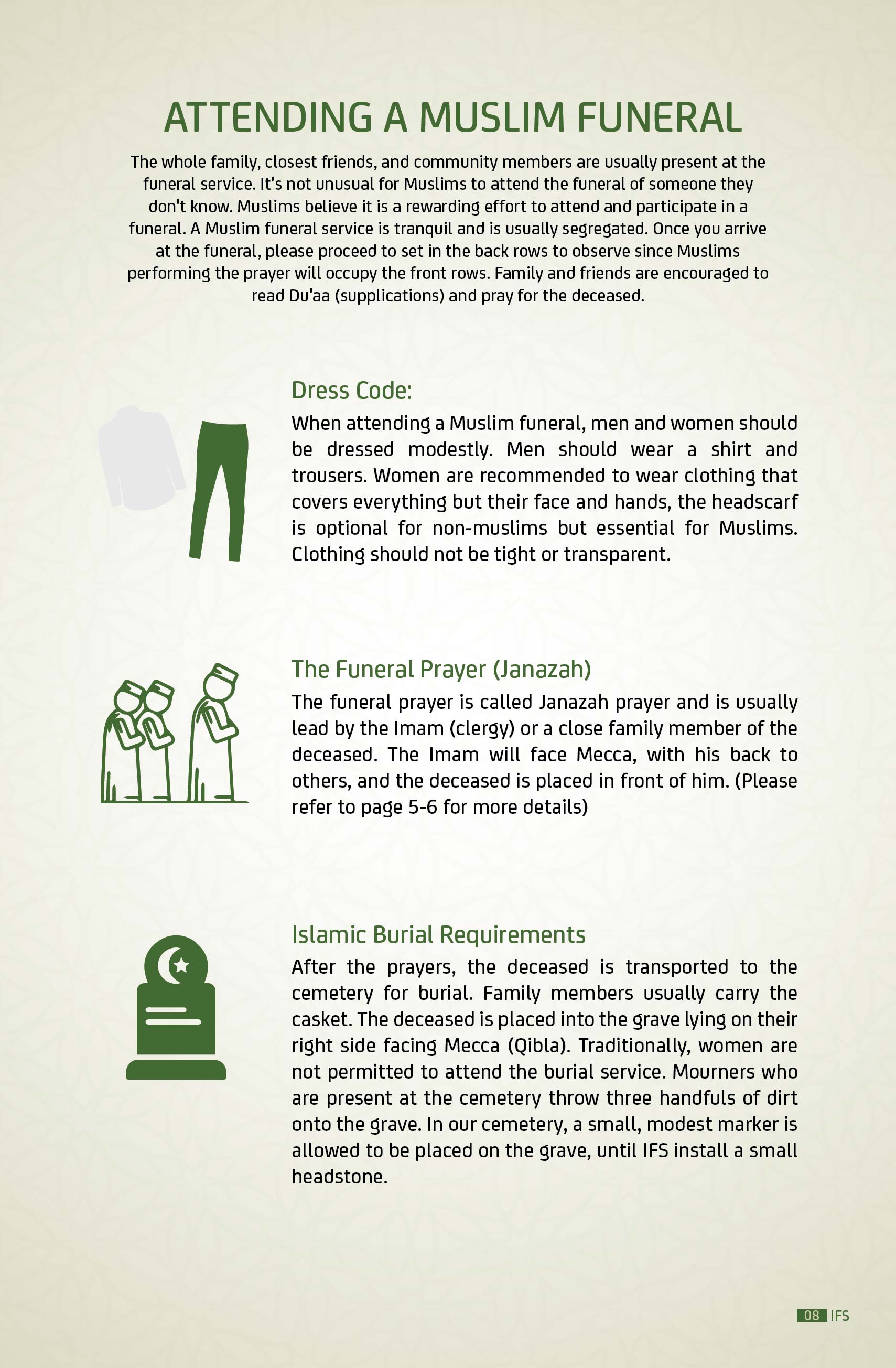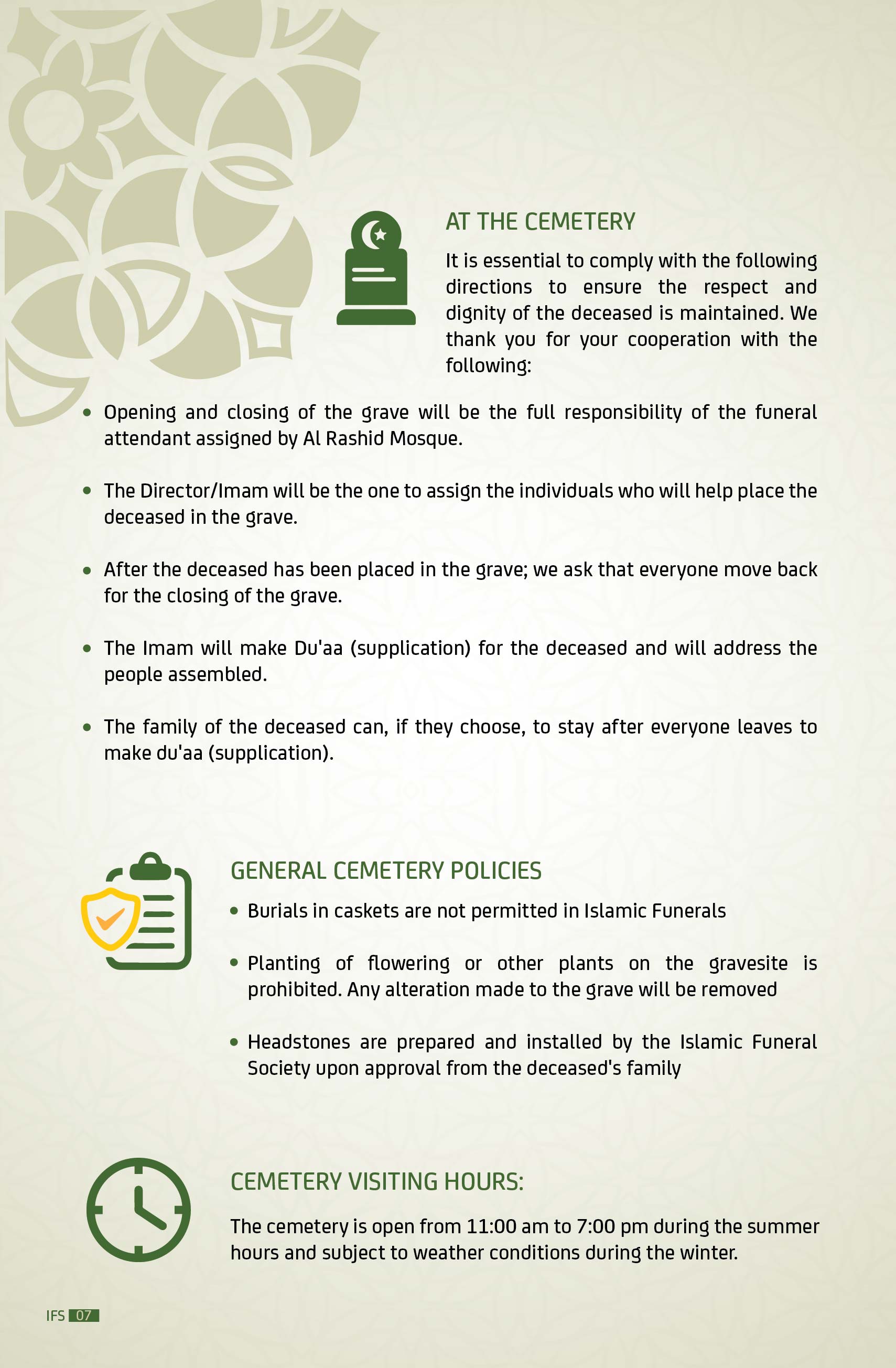 IFS is comprised of all the Mosques in Edmonton who elect an executive board to determine the direction and monitor the operation of funeral and burial services. IFS delegated the Canadian Islamic Centre (Al Rashid Mosque) to take care of all funeral services.