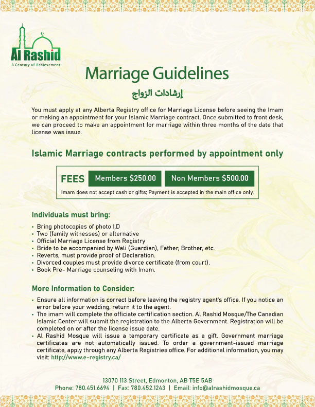 Our clergy can help couples start their journey in life together in accordance with Islamic requirements and laws of Alberta, and developing personalized Nikkah (marriage) contract. It is important that both parties understand the process and be guided through relevant Islamic teachings. The ceremony includes a short reminder of each other’s role, commitment and responsibilities.